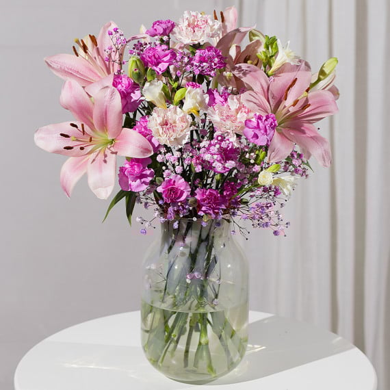 A feminine selection of pale pink Asiatic Lilies alongside hot pink spray Carnations, pink and white two tone Carnations and white Freesias. Beautifully finished with sweet pink Gypsophila, it will make a gorgeous gift to send for any special occasion.