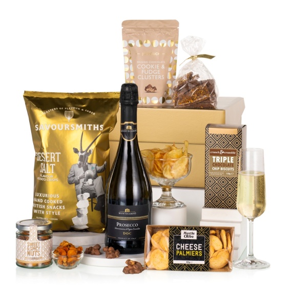 Celebrate in style with Let’s Celebrate, a luxurious gold gift box filled with Montecampo Prosecco, gourmet nuts, cheese palmiers, crisps, biscuits, cookie clusters and honeycomb chocolate. A sparkling, all-round gift for any joyful occasion. This hamper contains 7 items: Cambrook Sweet & Spicy Nut Mix 75g Crunch & Crumble Triple Chocolate Biscuits 150g Joypouch Cookie & Fudge Clusters 100g Myrtle & Olive Cheese Palmiers 80g Savoursmiths Desert Salt Crisps 150g Stas Chocolatier Broken Milk Chocolate with Honeycomb 150g Prosecco DOC Montecampo Italy 75cl 10.5% vol Packed in a gold gift box.