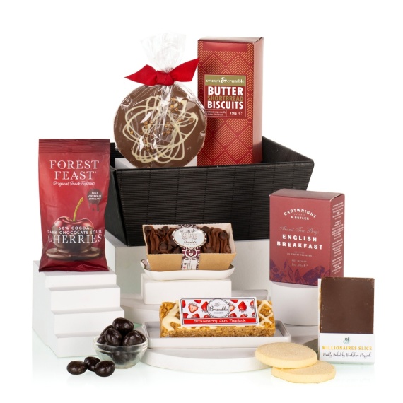 Our Tea & Treats gift pairs Cartwright & Butler English Breakfast Tea with shortbread, flapjacks, chocolate cake, cherries and a milk chocolate disc. A comforting, ready-to-give treat for any occasion. This hamper contains 7 items: Bramble Foods Strawberry Jam Flapjack 80g British Bakes & Cakes Chocolate Mini Loaf Cake 90g Cartwright & Butler English Breakfast 10 Finest Tea Bags 30g Crunch & Crumble Shortbread 150g Forest Feast 60% Cocoa Dark Chocolate Sour Cherries 40g Stas Milk Chocolate Disc 65g Yorkshire Flapjack Millionaires Slice 80g Packed in a black kraft tray.