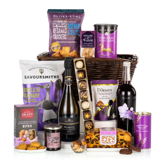 Our Indulgence Hamper combines Montecampo Prosecco with fine savoury snacks and sweet artisan treats, including cheddar bites, truffle crisps, fudge, cake and chocolates. Beautifully presented in a full willow basket for an elegant finish. This hamper contains 12 items: Dean’s Extra Mature Cheddar and Caramelised Red Onion Bites 100g Farmhouse Biscuits Chocolate Brownie Tube 100g Highfield Preserves Red Onion Marmalade 220g House of Fudge Rum & Raisin Fudge 100g Kingsdown Blackcurrant Sparkle 750ml Linden Lady Chocolate Selection 125g Market Town Bakery Rich Dundee Cake 400g Olives Et Al Spanish Reganas Crackers Seasoned with Rosemary & Sea Salt 225g Savoursmiths Truffle and Rosemary Potato Crisps 150g The Dormen Salted Caramel & Chocolate Raisin Mix 100g Yorkshire Popcorn Salt & Sweet Popcorn 40g Prosecco DOC Montecampo Italy 75cl 10.5% vol Packed in a brown willow storage basket.